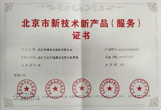 图1 选矿在线激光光谱分析系统示意图 图2 北京市新技术新产品认定证书