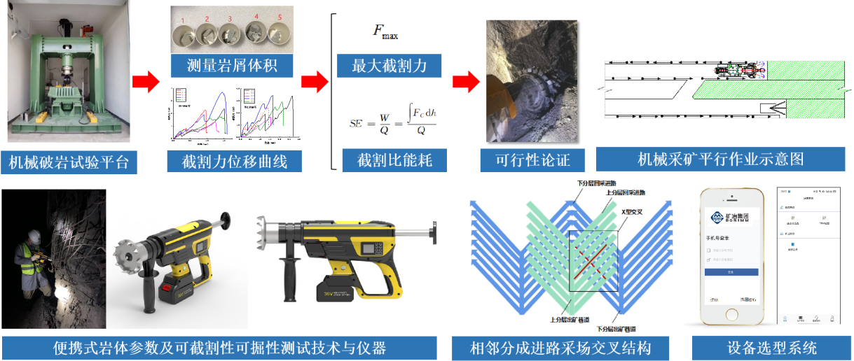 金属非金属矿山“凿岩爆破”开采方式决定了采矿工艺流程无法实现连续作业,而且爆破作业本身具有有害效应与较高安全风险。随着科技水平的发展,煤矿采煤机械、金属非金属矿山采掘机械及全断面隧道掘进机(TBM)等装备与技术相互影响渗透,机械破岩装备向着行业、技术融合的趋势进步,地下矿山迎来了由传统凿岩爆破开采向非爆机械连续开采的新跨越。机械连续开采技术是五大联赛在线的重点发展方向。技术方向在机械刀具破岩力学及优化、机械采矿岩石力学、机械采矿工艺、机械采矿机电一体化选型配套、机械开挖岩体稳定性控制及安全保障技术、金属非金属专用机械采掘装备等方面取得了众多创新研究成果,研发形成多项自主知识产权的新一代机械采矿装备及配套产品,构建出一套机械连续采矿的基础理论与技术体系。自主研发的机械破岩试验平台、机械破岩装备选型系统、新型机械破岩悬臂式采矿机、便携式可截割性测试分析仪等,已在众多项目中起到关键支撑作用,并在国内多家地下金属非金属矿山中实现了推广与应用。