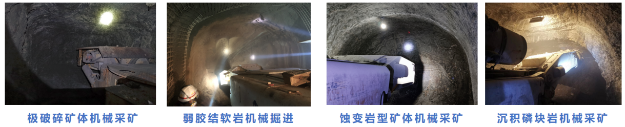 该技术适用于地下弱胶结或破碎矿岩内的采掘作业,机械连续开采方式对围岩扰动小,围岩自稳能力强,超欠挖率显著降低,单作业面采场生产能力效率是钻爆法的2~5倍,综合生产能力≥200 t/d,贫化率≤5%,损失率≤5%,综合技术经济指标优良;高度机械化非爆作业,采掘工艺连续,作业面自动化水平和安全性显著提高,劳动生产率提高至少60%。