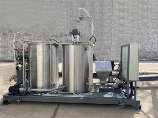 该技术与装备致力于解决超细粉体与水混合不均匀影响药剂溶液质量,以及配液场地狭小缺少专用设备等问题,提出风力输送胶粉和环形喷射水粉混合结构,保证了粉体流动顺畅、水粉混合均匀,杜绝了水包粉团的产生,且能快速提高胶液黏度。开发出配置能力为10~15m3/h的小型化、自动化混配装备,粉体浓度范围0%~0.6%,可用于冶金、选矿用瓜尔胶、聚合物等多种干粉物料的添加及药剂溶液制备。